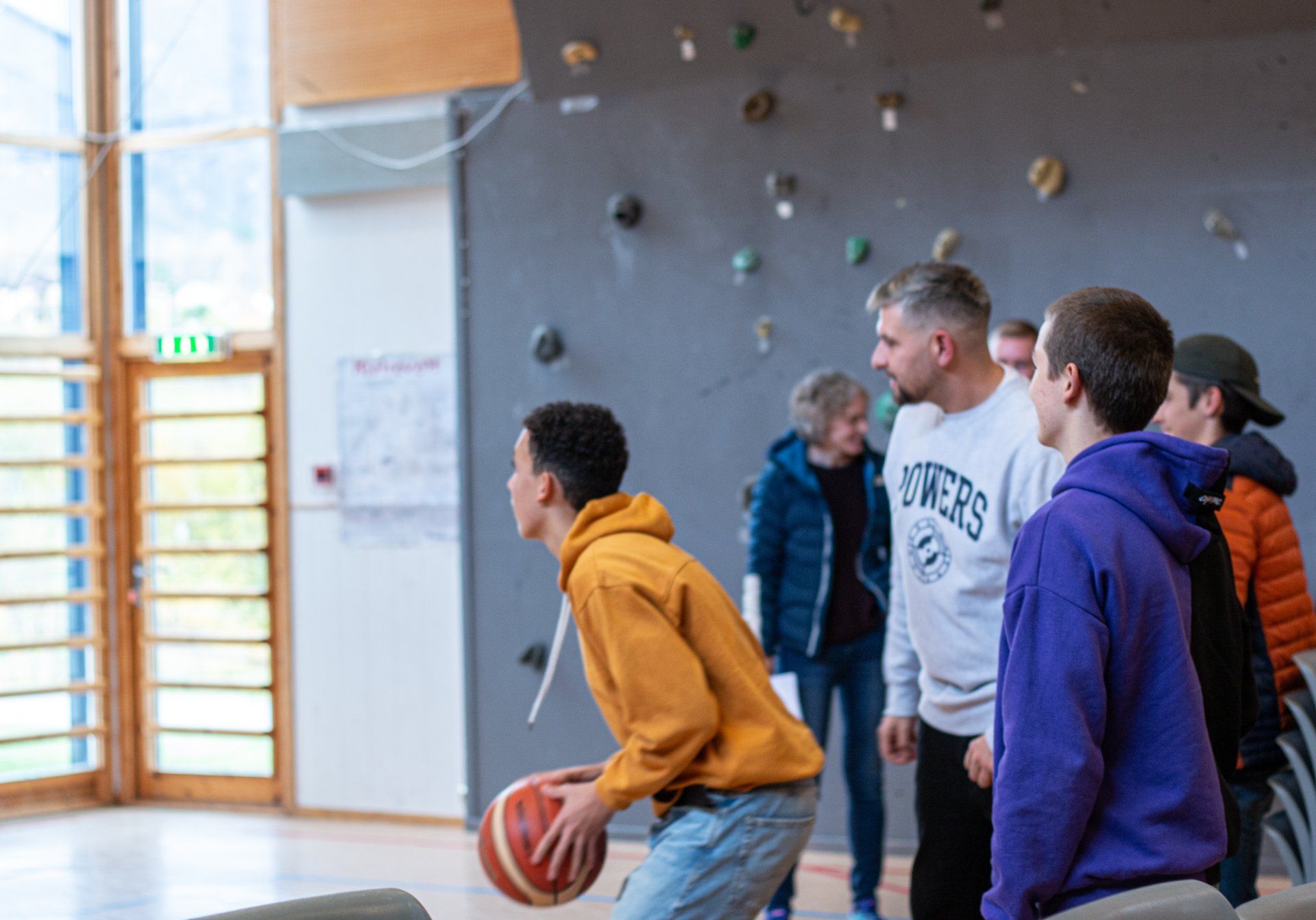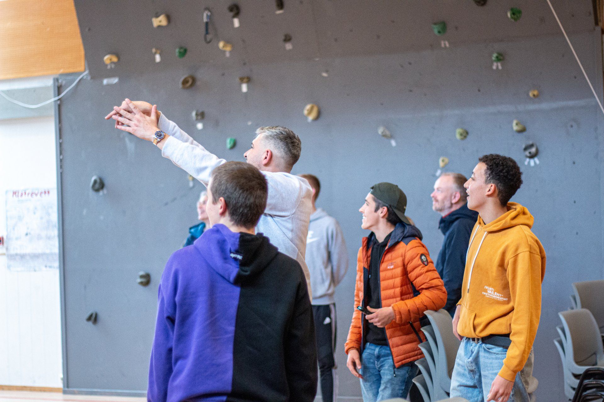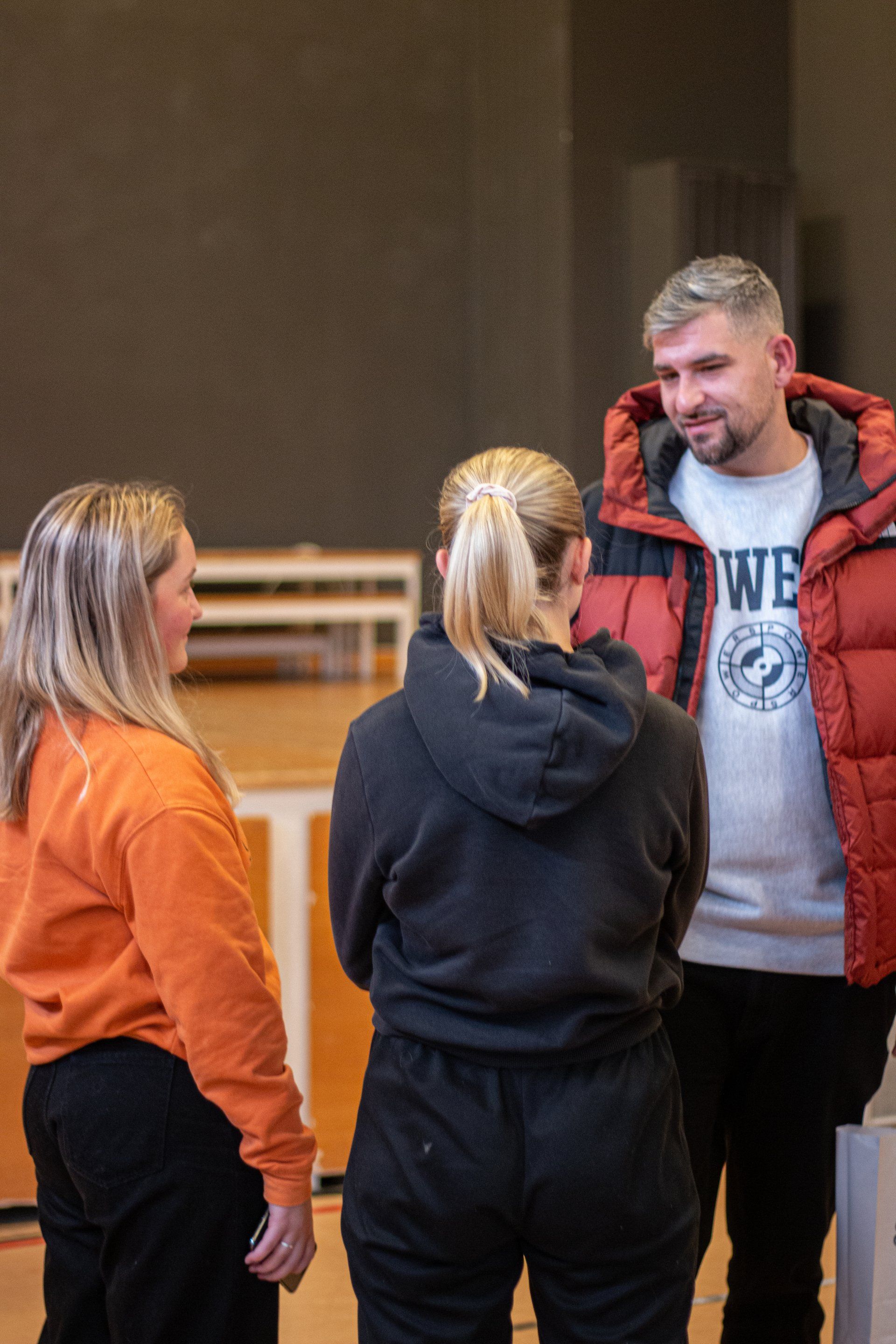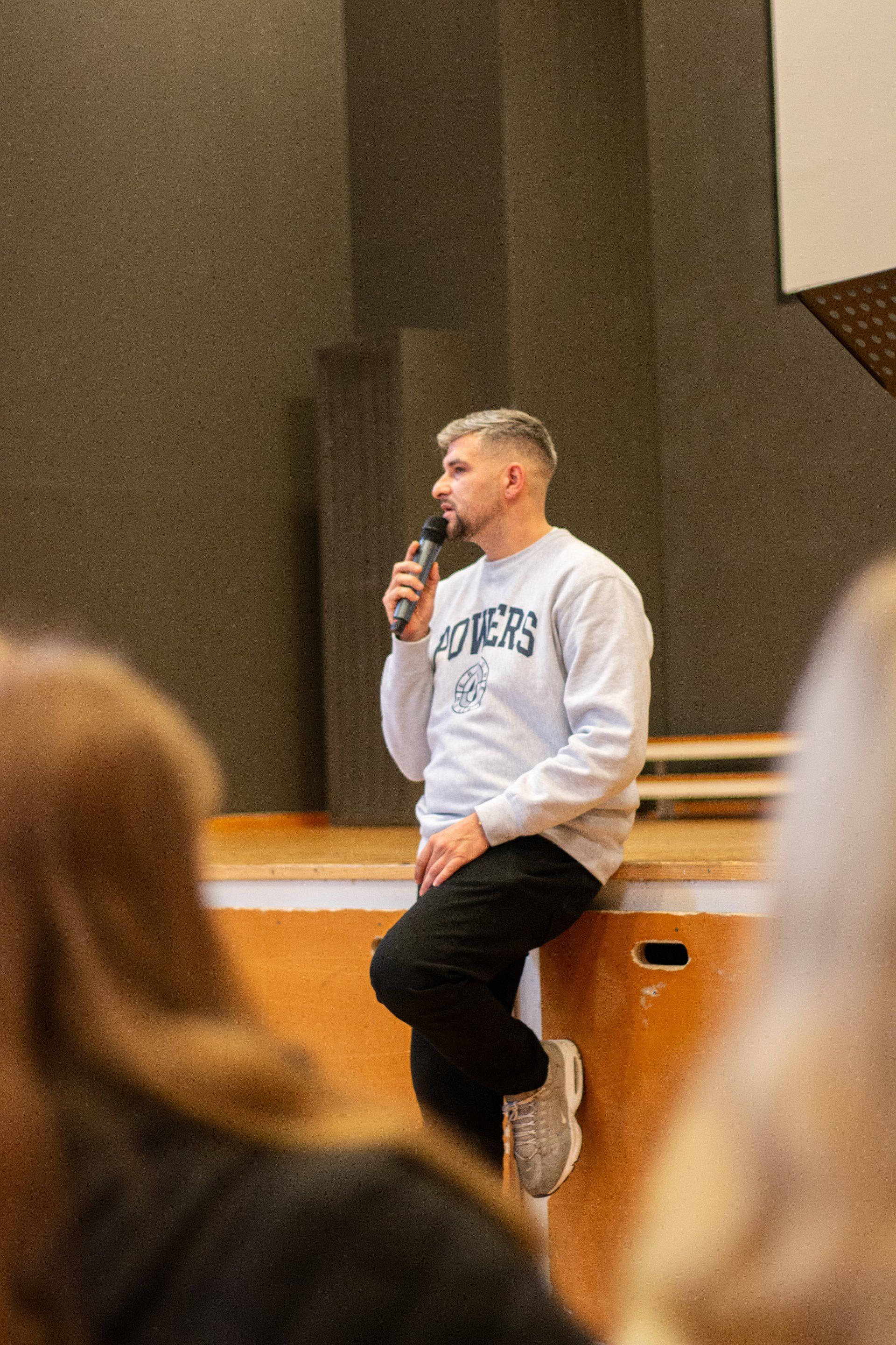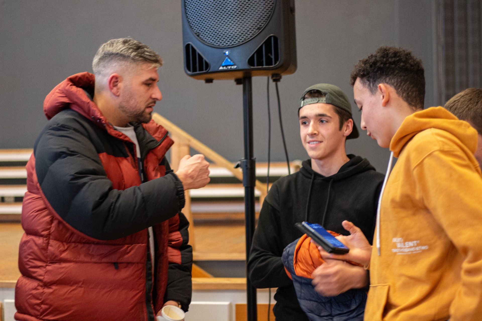 Fleire av elevane prata med Leo i etterkant av seminaret. Nokre gutar utfordra han også på ei lita runde med basketball før han måtte gå.