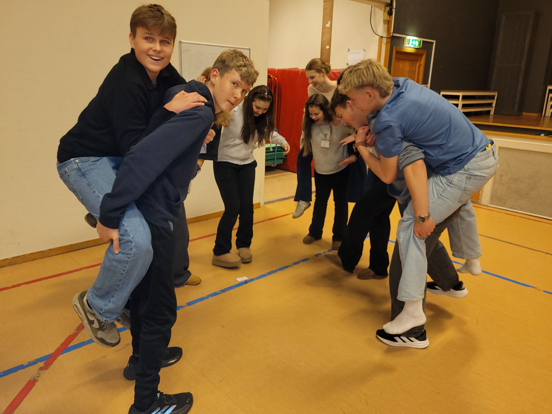 På denne leiken skulle gruppa ha eit konkret tal bein i bakken. For å lukkast måtte ein ty til kreative løysingar