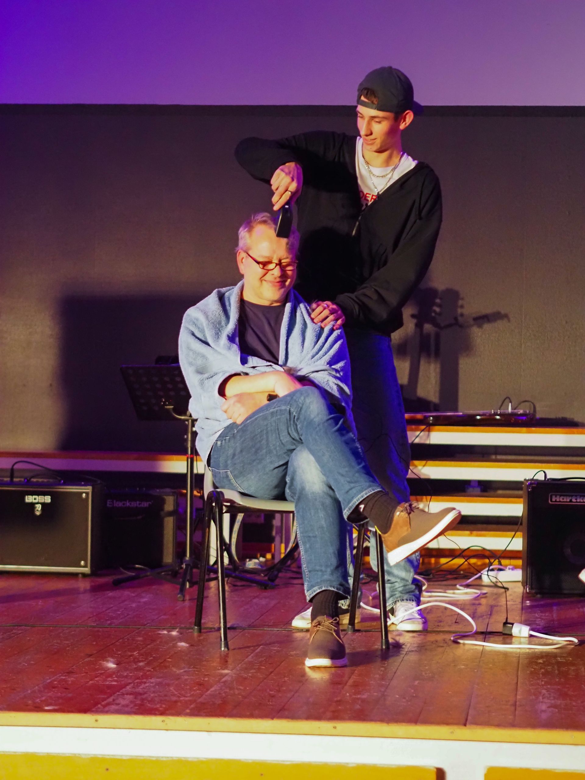Så var det tid for underhaldning. Først skulle ein elev konkurrere med ein lærar i ein quiz. Det førte til at lærar Roar Holte måtte ofre håret etter tap i quizen som må seiast å vere noko partisk i elevens favør.