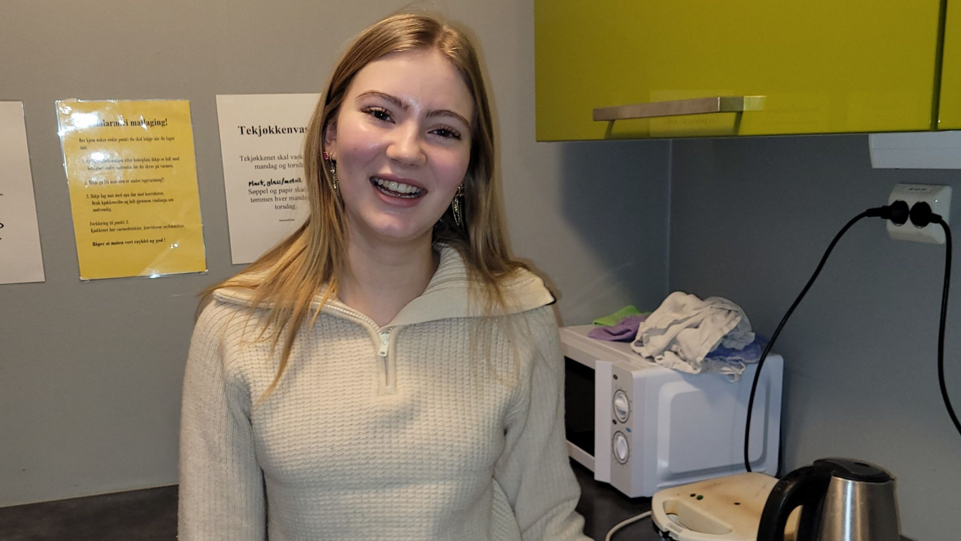 Medan me snakkar om «Kilden» kjem Emma Kleiven Hjelme innom kjøkkenet for å ordne seg litt mat, og seier: