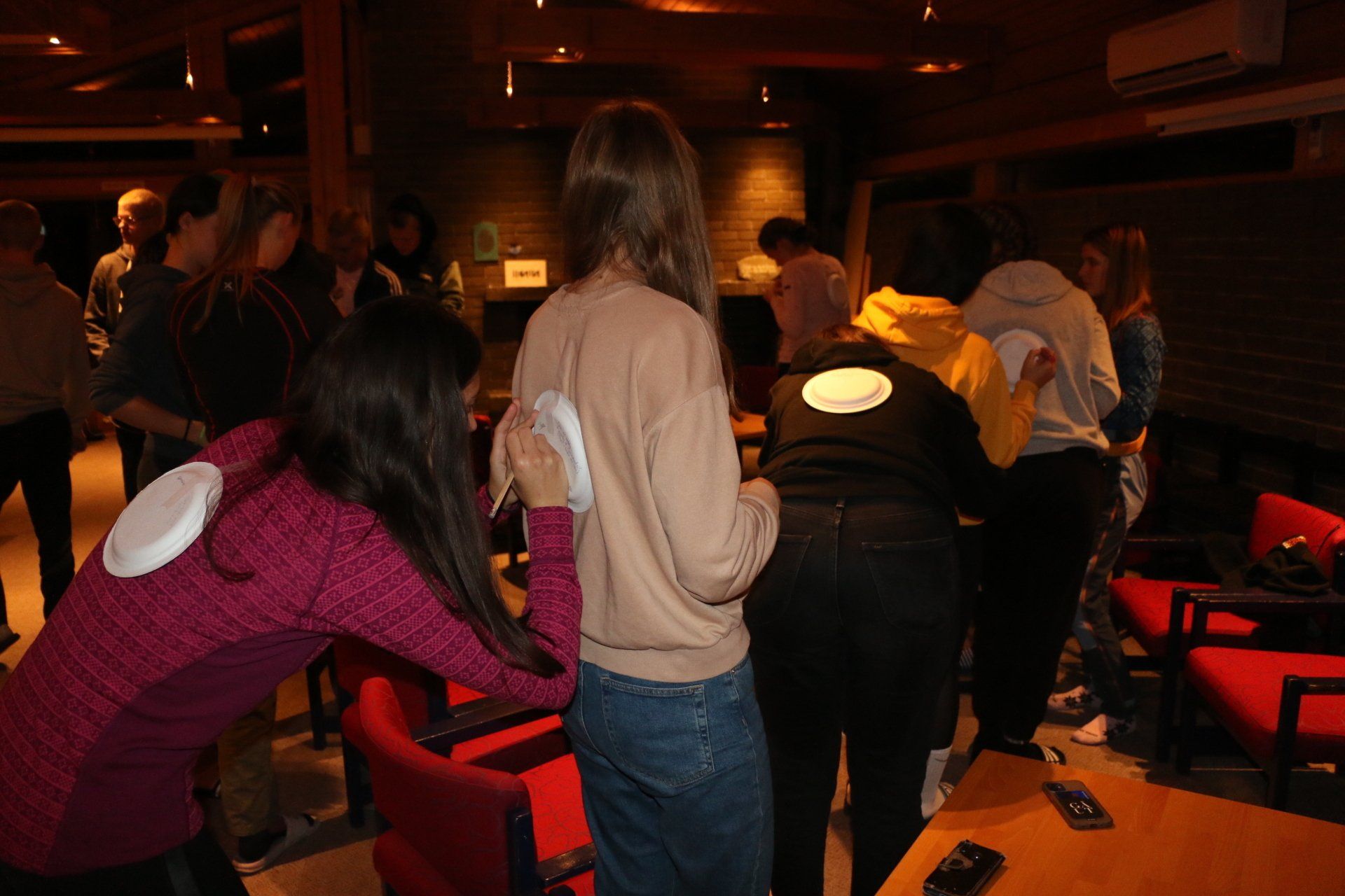Det vart også lagt til rette for å skrive godord til kvarandre. Elevane gjekk rundt med ein papptallerken på ryggen, og så skulle dei skrive gode ord på kvarandre sine papptallerkenar.